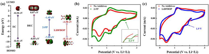| Fig. 1. (a) The LUMO and HOMO energies of EC, DEC, 2-FP and LiDFBOP. (b) The CV curves of Li||Cu cells using the electrolyte with and without 2-FP. (c) The CV curves of Li||Cu cells using the electrolyte with and without LiDFBOP. | |