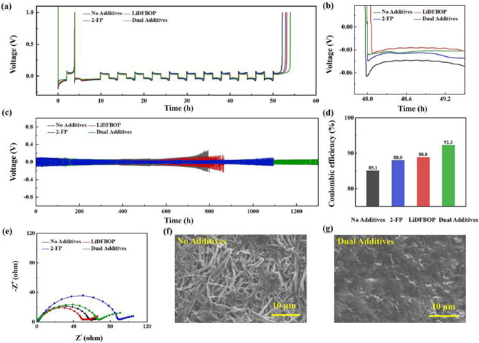 | Fig. 2. (a) Voltage profiles of Li||Cu cells. (b) The amplification of voltage profiles in (a). (c) Voltage profiles of Li||Li symmetric cells. (d) The average CE of the electrolyte without and with additives. (e) The EIS curves of the Li||Li cell using electrolyte without and with additives after 20 cycles. (f, g) The morphologies of the deposited Li on the anode surface after 200 cycles. | |