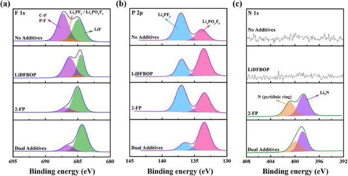 For better understanding the combined effect of 2-FP and LiDFBOP on the formation of SEI film, XPS was also conducted on the cycled lithium metal anode. Fig. 3 shows the XPS spectra results of lithium metal anode in the electrolyte with and without additives. According to the F 1s spectra, in the electrolyte with LiDFBOP, the content of LiF slightly increases, suggesting that the decomposition of LiDFBOP produces a small amount of LiF. The peak intensity of LiF of the electrolyte with 2-FP is significantly enhanced than that without 2-FP. A LiF-rich SEI film can effectively improve the mechanical stability and compactness of lithium metal anode [37]. Meanwhile, LiF has insulation characteristics, which can effectively reduce the penetration of electrons through the anode interface, which can prevent the side reaction between electrolyte and electrode, and improve the cycle stability [38]. For the dual-additives, a significantly stronger LiF peak can also be observed, which is mainly attributed to the reduction of two additives. In the P 2p spectra, the electrolyte with LiDFBOP has much stronger peak for LixPOyFz, which has been considered as an effective component for Li ion transport capacity of SEI film [33]. Similarly, for the electrolyte with dual-additives, a significantly stronger LixPOyFz peak was detected. Moreover, the N 1s spectra of anode interface film is displayed in Fig. 3c, the components of pyridine N peak and Li3N peak could be observed by 2-FP, which can inhibit the formation of lithium dendrites [27]. In contrast, no N 1s spectra was detected in the electrolyte without 2-FP. In general, benefiting from the co-reduction of 2-FP and LiDFBOP, a SEI film rich in LiF, LixPOyFz and Li3N can be formed on the anode-electrolyte interface.