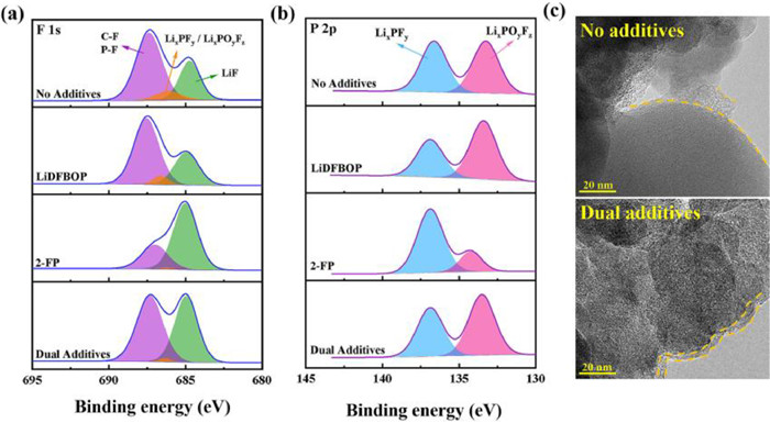 | Fig. 4. The XPS spectra results of SPAN electrodes after 200 cycles: (a) F 1s, (b) P 2p. (c) TEM of SPAN-cathode surface morphology after 200 cycles in Li||SPAN cells without and with dual-additives, where the dotted area is the CEI film. | |