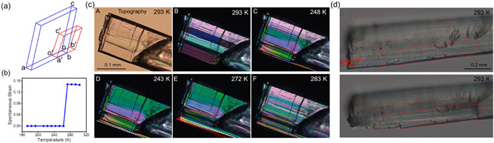 | Fig. 4. (a) The unit cell of BCC at LTP and HTP. (b) Temperature-dependent ferroelastic spontaneous strain εs. (c) The ferroelastic domain walls evalution of BBC, natural optical microscope images for (A) single crystal of BCC, (B-F) evolutions of the ferroelastic domain structure for BCC in the cooling-heating runs, (d) ferroelastic domain structure changes (in red box) upon shearing stress on BBC mono crystal at 293 K. | |