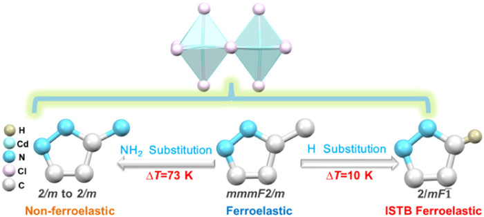 Herein, we reported three 1D ABX3 OIHP compounds, (3-methylpyrazolium)CdCl3 (3-MBCC), (3-aminopyrazolium) CdCl3 (3-ABCC), and (pyrazolium)CdCl3 (BCC). The latter two is designed based on crystal engineering theory (Scheme 1). 3-MBCC exhibits a mmmF2/m ferroelastic phase transition. After CH3/NH2-substitution, the phase transition temperature (Tp) increases markedly from 263 K in the former to 336 K in the latter. The big boost of Tp 73 K is difficult to achieve. This is attributed to the NH2 substitution increasing the number of hydrogen bonds and enhancing the kinetic energy barrier. Furthermore, the Tc of BCC increased by 10 K after CH3/H-substitution and exhibited rare ISTB ferroelasticity. Interestingly, its ISTB mechanism originates from the displacement of the organic cations which is different from the common order-disorder mechanism. These mean that BCC maintaining ferroelasticity in HTP until the melting point. This work opens a new vision to achieve high temperature ferroelastic materials and benefits for the application in molecular ferroelastic device.