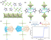 | Fig. 2. (a) The molecular packing model and 1D inorganic chain of BCC in LTP 173 K. (b) The lengths of Cl-N and the angles of N-Cl-N are indicated in LTP 173 K and HTP 303 K. (c) Dihedral angle φ changes between the two groups HB planes in LTP 173 K and HTP 303 K. (d) Schematic diagram of ferroelastic phase transition mechanism (up) and temperature dependences of φ (down). | |