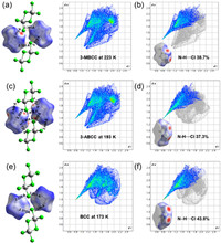 | Fig. 3. (a, b) The HB length between Cl and H aotoms, visualization map of the distribution of the interactions and the 2D fingerprint plots of 3-MBCC in LTP at 223 K, (c, d) 3-ABCC in LTP at 193 K, and (e, f) BCC in LTP 173 K. | |
