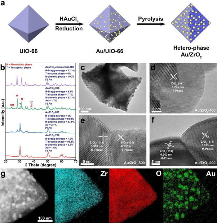 As shown in Fig. 1b, X-ray diffraction (XRD) analysis indicates that the pyrolysis of Au/UiO-66 yield monoclinic/tetragonal hetero-phase Au/ZrO2. The XRD patterns of Au/ZrO2–700, Au/ZrO2–800, Au/ZrO2–900 derived from Au/UiO-66 at different temperatures and that of Au-ZrO2-commercial at 800 ℃ were compared and analyzed. The characteristic diffraction peaks of ZrO2 at 24.0°, 28.2°, 31.5° correspond respectively to the (110), (