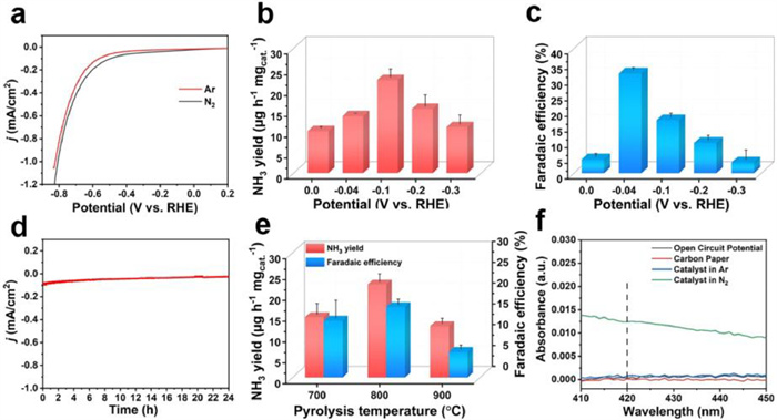 | Fig. 3. Electrocatalytic NRR on Au/ZrO2–800 catalyst in 0.1 mol/L KOH electrolyte. (a) LSV curves in N2- and Ar-saturated electrolytes. (b) NH3 yield at different applied potentials. (c) FEs at diverse applied potentials. (d) Chronoamperometry test at –0.1 V for 24 h. (e) Comparison of electrocatalytic NRR on Au/ZrO2–700, Au/ZrO2–800 and Au/ZrO2–900 catalysts in 0.1 mol/L KOH electrolyte. (f) UV–vis absorption spectra under different conditions. | |