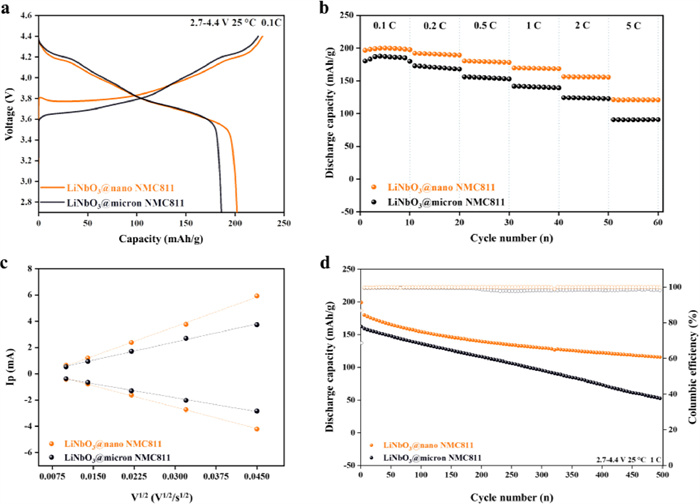 After being coated with LiNbO3 on the surface, the electrochemical performance of nano NMC811 is significantly better than that of micron NMC811. As shown in Fig. 3a, LiNbO3@nano NMC811 has higher initial discharge specific capacity and Coulombic efficiency, which may be due to the special crystal face of nano NMC811 prepared by molten salt method, and the coating of LiNbO3 increases the diffusion of lithium ions. However, for micron NCM811 spherical particles prepared by high-temperature solid-state sintering method, coating LiNbO3 has little effect on its initial discharge specific capacity. Otherwise, the initial charge voltage of the LiNbO3@nano NMC811 can reach 3.8 V, far exceeding the voltage of the LiNbO3@micron NMC811 at 3.6 V, which is due to the presence of a lithium-poor layer on the surface of nano particles. The rate performance was evaluated at various rates ranging from 0.1 C to 5 C (Fig. 3b). The LiNbO3@nano NMC811 delivers a higher reversible capacity comparable to the LiNbO3@micron NMC811 at the same current. Even at a rate of 1 C, the LiNbO3@nano NMC811 delivers a reversible capacity of 169.7 mAh/g (86.3% of the capacity at 0.1 C), higher than 141.8 mAh/g of micron NMC811 (78.6% of the capacity at 0.1 C). We tested the CV curve at various scan rate from 0.1 mV/s to 2 mV/s (Fig. S6 in Supporting information). Fig. 3c shows a clearly liner relationship between peak current and scan rate, indicating diffusion-controlled behavior. The slope of the liner indicated that Li-ion diffusion of LiNbO3@nano NMC811 is larger than LiNbO3@micron NMC811 at charge and discharge process. This proves to be a significant advantage in using a LiNbO3@nano NMC811 as a cathode material. During the long-term cycling at 1 C, the LiNbO3@nano NMC811 maintains a capacity of 115.6 mAh/g after 500 cycles when cycled in the voltage rang of 2.7–4.4 V, while the LiNbO3@micron NMC811 has a capacity of 52.3 mAh/g applying the same measurement protocol (Fig. 3d).