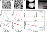| Fig. 1. SEM image of (a) micron NMC811 and (b) nano NMC811. Single crystal particle size distribution of (c) micron NMC811 and (d) nano NMC811. (e) STEM image of nano NMC811. (f) High angle annular dark field (HAADF) image and corresponding fast Fourier transform (FFT) of nano NMC811. (g) XRD pattern of nano NMC811. (h) Charge/discharge profile at 0.1 C, (i) rate performance and (j) discharge capacity and Coulombic efficiency during cycling at 0.5 C of nano NMC811 and micron NMC811. | |