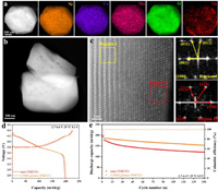 | Fig. 2. (a) Elements mapping of LiNbO3@nano NMC811. (b) STEM image of LiNbO3@nano NMC811. (c) HAADF image and corresponding FFT of LiNbO3@nano NMC811. (d) Charge/discharge profile at 0.1 C, (e) discharge capacity and Coulombic efficiency during cycling at 0.5 C of nano NMC811 and LiNbO3@nano NMC811. | |