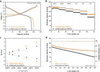 | Fig. 3. Electrochemical performance comparison of LiNbO3@nano NMC811 and LiNbO3@micron NMC811. (a) Charge/discharge profile at 0.1 C, (b) rate performance, (c) apparent diffusion coefficient, (d) discharge capacity and Coulombic efficiency during cycling at 1 C of LiNbO3@nano NMC811 and LiNbO3@micron NMC811. | |
