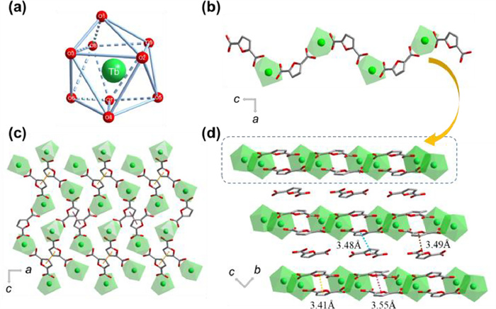 Tb-FDA is crystallized in triclinic space group P-1 (Table S1 in Supporting information). The asymmetric unit of Tb-FDA contains the following crystallographically independent components: two Tb3+ ions, two coordinated FDA2− and ten coordinated water molecules, a FDA2− counterion and six lattice water molecules. Each Tb3+ ion is nine-coordinate in a spherical capped square antiprism environment, completed by four oxygen atoms from four carboxylate groups of two FDA2− anions, and five oxygen atoms from five water molecules (Fig. 1a). Tb3+ ions are bridged by carboxylate groups of FDA2− to form a chain (Fig. 1b). The chains are connected by π ···π interactions of the coordinated FDA2− to form a layer (Fig. 1c). The layers are further connected by FDA2− counter anions by π···π interactions into a 3D supramolecular structure (Fig. 1d).