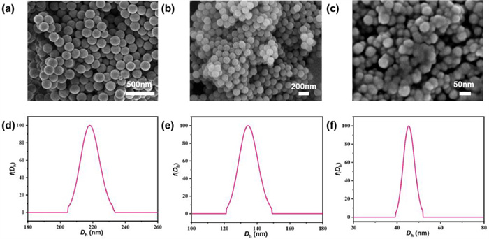 Dynamic light scattering (DLS) showed hydrodynamic size distributions of nano PS in aqueous solutions (Figs. 2d-f), whose hydrodynamic diameter are mainly about 218, 134, 43 nm, respectively, which are slightly larger than the sizes of PS nanoparticles observed by the SEM.