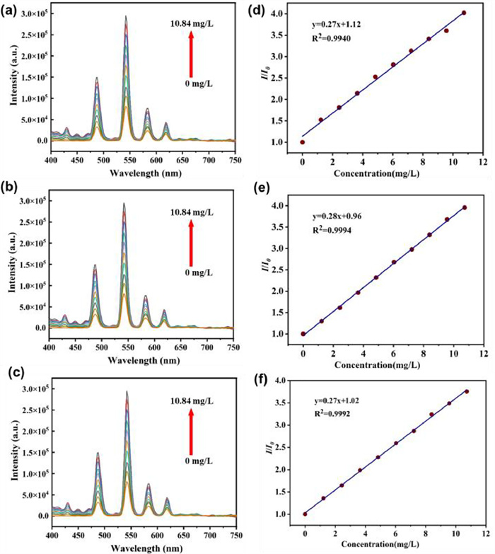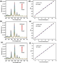 | Fig. 3. Emission spectra of Tb-FDA dispersed in deionized water added nano PS with (a) 40 nm, (b) 100 nm, (c) 200 nm and fitting linear plots at 544 nm of Tb-FDA towards nano PS with (d) 40 nm, (e) 100 nm, (f) 200 nm in deionized water at the concentrations from 0 to 10 mg/L. | |