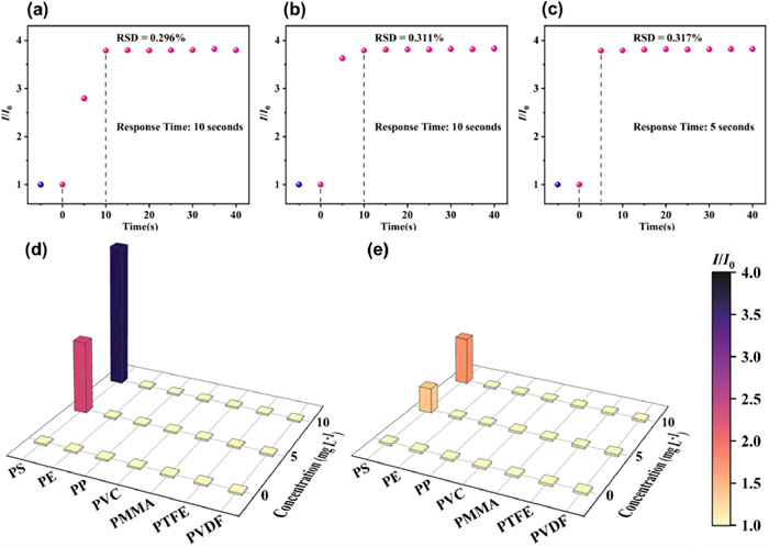 | Fig. 4. The response times of Tb-FDA for detecting PS with particle sizes of (a) 40 nm, (b) 100 nm and (c) 200 nm in deionized water. Selectivity of Tb-FDA for PE, PP, PVC, PMMA, PTFE and PVDF (d) in deionized water and (e) in artificial seawater. | |