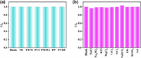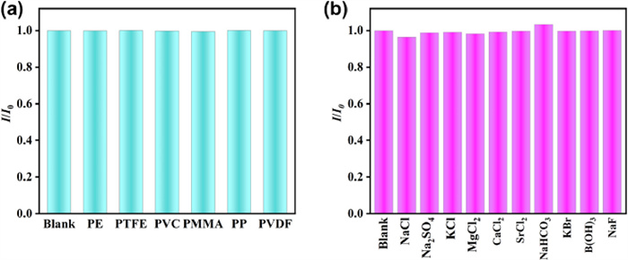 | Fig. 5. Luminescent intensities of Tb-FDA in the present of different (a) NPs including PE, PTFE, PVC, PMMA, PP and PVDF and (b) soluble solids including NaCl, Na2SO4, KCl, MgCl2, CaCl2, SrCl2, NaHCO3, KBr, B(OH)3 and NaF. | |