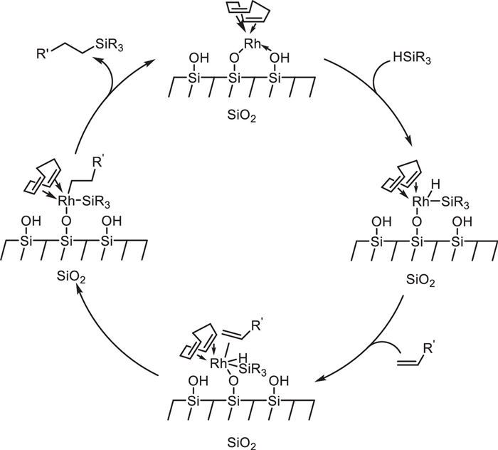 In 2008, Marciniec et al. reported cyclooctadiene ligand-containing rhodium siloxide complex immobilized with silanol groups on silica surface Aerosil 200 [24,25]. This single-site complex showed good activity in hydrosilylation of heptamethyltrisiloxane with 1-heptene, vinylheptamethyltrisiloxane and methyleugenol. It offered 20 recycling runs without loss of activity and selectivity in hydrosilylation of vinylheptamethyltrisiloxane with heptamethyltrisiloxane. The detailed mechanism studies disclosed that the pathway of hydrosilylation catalyzed by silica-supported rhodium siloxide complexes is different from homogeneous complexes system (Fig. 1). In 2009, the mononuclear rhodium-silica-phosphine precursor was also used to fix on the surface of silica Aerosil 200 [26]. The catalytic activity in the hydrosilylation of 1-hexadecene with heptamethyltrisiloxane was higher than that of the catalyst without phosphorus ligand, and the catalytic activity did not decrease after 10 cycles (Fig. 2).