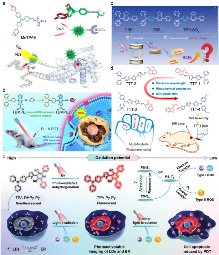 | Fig. 2. (a) Schematic illustration of MeTPAE with nuclei-targeting function for PDT. Reproduced with permission [58]. Copyright 2022, Wiley-VCH. (b) Schematic illustration of molecular design diagram of a high-performance AIE photosensitizer with cell membrane-targeting function for fluorescence imaging-guided PDT. Reproduced with permission [59]. Copyright 2022, The Royal Society of Chemistry. (c) Schematic illustration of the structures of DBP, TBP and TBP-SO3. Reproduced with permission [60]. Copyright 2022, The Royal Society of Chemistry. (d) Schematic illustration of the structures of TTT-1, TTT-2, TTT-3 and TTT-4. Reproduced with permission [61]. Copyright 2021, Elsevier. (e) Schematic diagram of the structure of 1,4-dihydropyridine derivatives for both LD and ER-targeting imaging and therapy. Reproduced with permission [62]. Copyright 2023, Wiley-VCH. | |