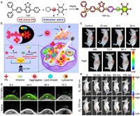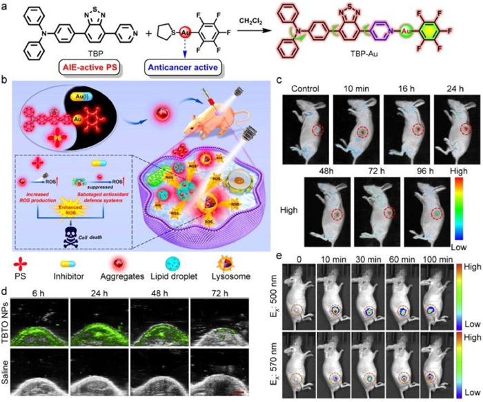 | Fig. 3. (a) Molecular design and synthetic route of TBP-Au. (b) Schematic illustration of TBP-Au for anticancer therapeutics through synergistic effects of photodynamic therapy and thioredoxin reductase (TrxR) inhibition. (c) In vivo real-time fluorescence imaging in HeLa tumor-bearing nude mice after intratumor injection of TBP-Au (λex: 530 nm). Reproduced with permission [84]. Copyright 2021, American Chemical Society. (d) In vivo real-time PA images of the tumor site in the mice after tail intravenous injection with TBTO NPs. (e) In vivo real-time NIR fluorescence imaging in tumor site after intratumoral injection with TBTO NPs. Reproduced with permission [86]. Copyright 2021, Elsevier. | |