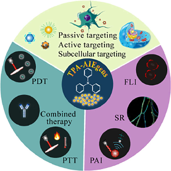 With the in-depth understanding of tumor biology and mechanism based on tumor diagnosis and treatment, the precise delivery of photoactive agents to the tumor sites or specific organelles is a prerequisite for efficient cancer treatment [48–50]. Given the favorable characteristics of TPA-AIEgens, many researchers have developed a variety of photoactive agents targeting tumor foci, nuclei and organelles in accordance with the types of TPA-AIEgens. These TPA-AIEgens have been widely applied for biological imaging and phototherapy, which can minimize the damage to health tissues and reduce non-specific drug toxicity and achieve the accurate treatment.