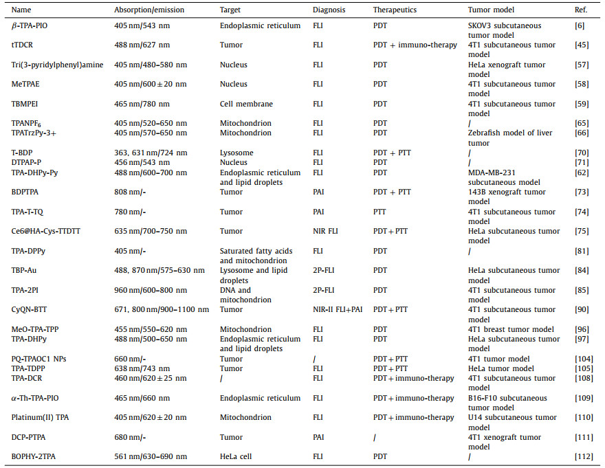 Table 1 The summary of TPA-AIEgens for tumor theranostics. |