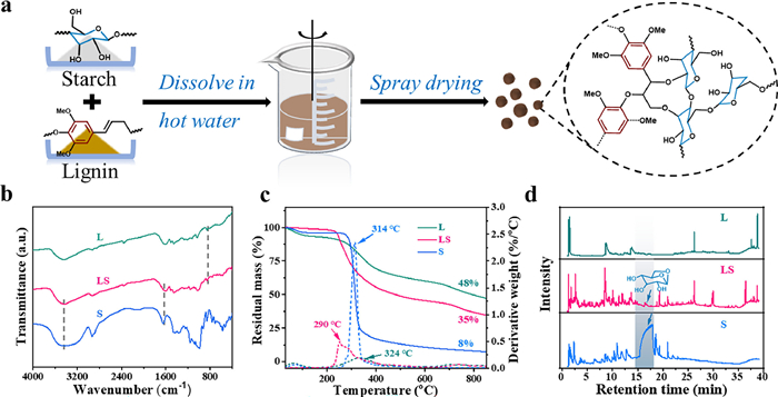 | Fig. 1. (a) Schematic diagram of precursor reconstitution. (b) FTIR spectra. (c) TG-DTG curves. (d) Py/GC–MS spectrum of the precursors at their corresponding pyrolysis peak temperature. | |