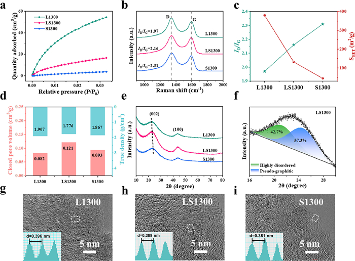 | Fig. 2. Structural characterization of the HCs. (a) CO2 adsorption isotherms. (b) Raman spectra. (c) The changing trends of ID/IG and specific surface area measured by CO2 adsorption. (d) True density and closed pore volume. (e) XRD patterns. (f) Fitting result of the (002) peak. (g–i) HRTEM images. Insets in (g–i) show the corresponding FFT patterns. | |