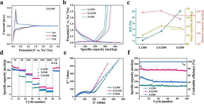 The electrochemical properties of the HCs were evaluated in half cells. Fig. 3a and Fig. S5 (Supporting information) show the cyclic voltammetry (CV) curves. During the first sodiation process, two broad peaks appear at 1.0 and 0.4 V, corresponding to the formation of solid electrolyte interphase (SEI) film [27]. In the following cycles, the CV curves are well overlapped, demonstrating the reversible and stable transfer of Na+ ions. Fig. 3b shows the galvanostatic charge-discharge (GCD) curves which are composed of slope (> 0.1 V) and plateau (< 0.1 V) regions. The reversible charge (desodiation) capacity and initial Coulombic efficiency (ICE) of L1300, LS1300, and S1300 are 324.9 mAh/g, 72.3%, 356.9 mAh/g, 75.4%, and 306.8 mAh/g, 82.2%, respectively. It finds that ICE shows a continuous upward trend from L1300 to S1300 (Fig. 3c). Combined with the results in Fig. 2c, it can be presumed that the SSA of the prepared HCs, rather than the defects, exerts a major influence on the ICE. The larger SSA, the more SEI side reactions occur. Moreover, the slope and plateau capacities assigned based on the second discharge (sodiation) curves were also provided (Fig. 3c and Fig. S6 in Supporting information). LS1300 shows the highest slope and the highest plateau capacities, and the sodiation mechanism will be discussed in the later section.