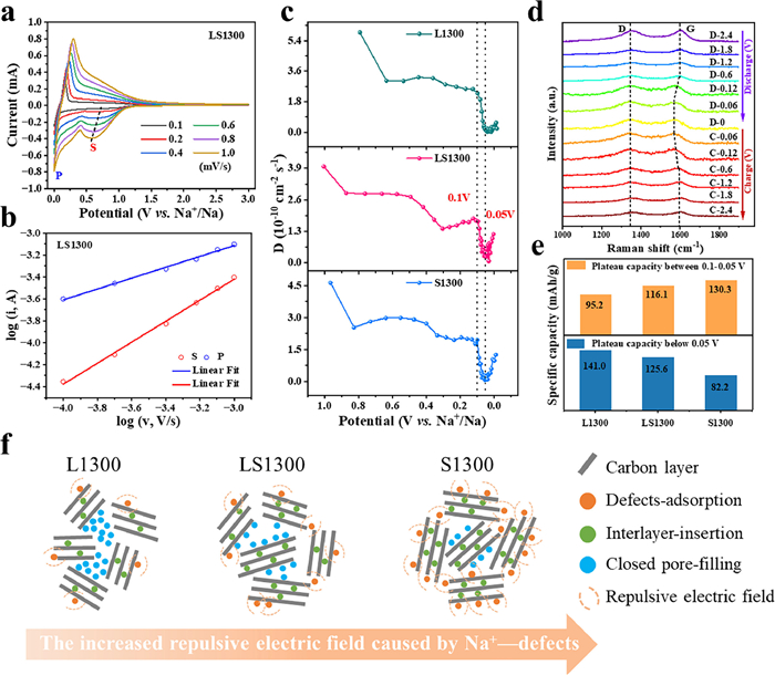 | Fig. 4. Sodium storage behavior investigation. (a) CV curves measured at various scans. (b) The correlations of scan rate and peak current. (c) The Na+ ions apparent diffusion coefficients during sodiation process. (d) In-situ Raman spectra. (e) The plateau capacity calculated from the second cycle discharge curves. (f) The effect of defects on the Na+ ions closed pore filling. | |