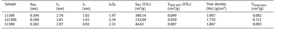 CO2 adsorption technique was employed to detect the porosity properties of the final HCs (Fig. 2a). The specific surface area (SSA) and open pore volume of L1300, LS1300, and S1300 are 380.14, 132.09, and 44.61 m2/g and 0.099, 0.030, and 0.007 cm3/g, respectively (Table 1). This phenomenon indicates that the change of precursor components exerts an obvious effect on the evolution of porous carbon skeleton. Raman spectra were conducted to characterize the defect concentration of the carbon materials (Fig. 2b). Two typical peaks locate at 1350 and 1580 cm−1, which are assigned to the D band and G band, respectively. The calculated ratio of ID/IG is 1.97, 2.16, and 2.31 for L1300, LS1300, and S1300, respectively. These results indicate that the polysaccharide structure facilitates the reduction of the SSA of carbon materials but increases the defects, while the aromatic structure increases the formation of open pores but reduces the defects (Fig. 2c). In addition, Small angle X-ray scattering (SAXS) was adopted to detect the porous structures in HCs. As shown in Fig. S3 (Supporting information), a broad plateau appears around 0.1 Å−1, which is a typical feature for the existing of closed pores [8,12]. To acquire the accurate closed pore volume, true density test was performed using helium as the analysis gas [3]. Ideal graphite has a layered structure without internal pores, and its true density is 2.26 g/cm3. The total closed pore volume in HCs can be calculated according to the equation [3,14].