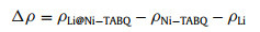 The charge density difference of single Li atom adsorbed at the most favorable site on the 2D Ni-TABQ monolayer by dint of the undermentioned equation: