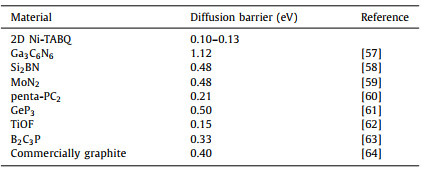 Table 2 Comparison of diffusion barriers of 2D Ni-TABQ monolayer as anode for LIBs with available literature precedents. |
