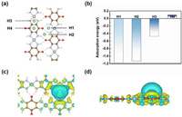 | Fig. 2. (a) The unequal sites in 2D Ni-TABQ monolayer. (b) Adsorption energies of single Li atom adsorbed at H1 site, H2 site, H3 site and H4 site on 2D Ni-TABQ monolayer. (c) Top and (d) side view of charge density difference of Li-adsorbed 2D Ni-TABQ monolayer at H1 site. | |