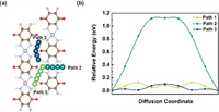 | Fig. 3. (a) Possible diffusion pathways for Li ions on 2D Ni-TABQ monolayer. (b) Calculated diffusion energies profiles of Li ions on 2D Ni-TABQ monolayer along different diffusion pathways. The light green, dark green and dark blue ball-chains are migration pathways of path 1, path 2 and path 3, respectively. | |