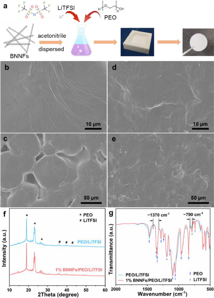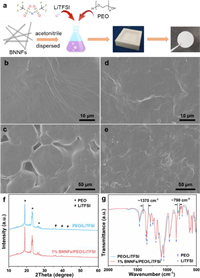| Fig. 1. (a) Schematic diagram of the preparation process of PEO-based SPEs, SEM images of (b, c) PEO/LiTFSI and (d, e) 1% BNNFs/PEO/LiTFSI, (f) XRD patterns and (g) FT-IR spectra of PEO/LiTFSI and 1% BNNFs/PEO/LiTFSI. | |