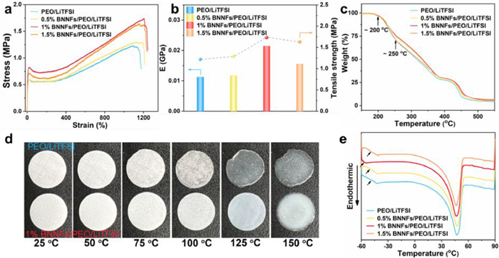 | Fig. 3. (a) Stress–strain curves, (b) Young's modulus and tensile strength, (c) TG curves of PEO-based SPEs with different amounts of BNNFs additions. (d) Photos of heating experiment of PEO/LiTFSI and 1% BNNFs/PEO/LiTFSI in the air at 25–150 ℃ and (e) DSC curves of PEO-based SPEs with different amounts of BNNFs additions. | |