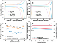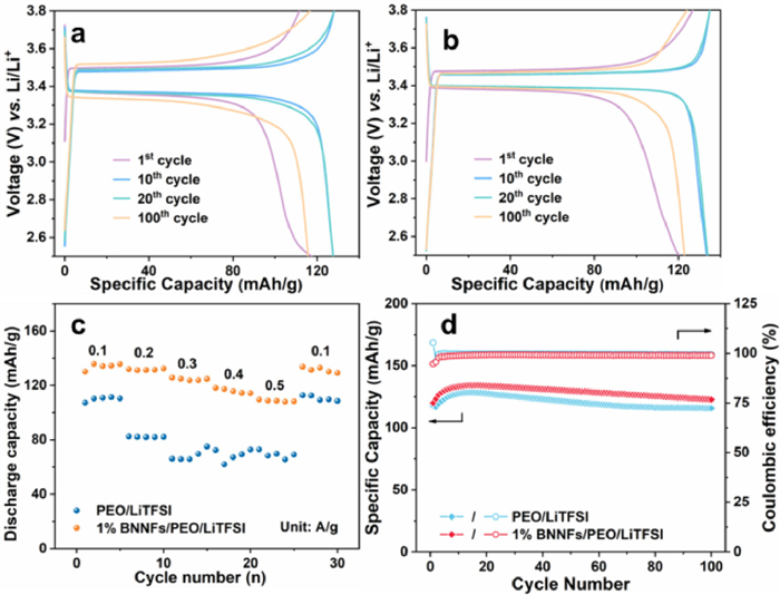 | Fig. 4. Charge-discharge curves of (a) Li||PEO/LiTFSI||LFP and (b) Li||1% BNNFs/PEO/LiTFSI||LFP at the 1st, 10th, 20th, and 100th cycles. (c) Rate capacity, and (d) cyclic stability of Li||PEO/LiTFSI||LFP and Li||1% BNNFs/PEO/LiTFSI||LFP at 60 ℃ and 0.1 A/g. | |