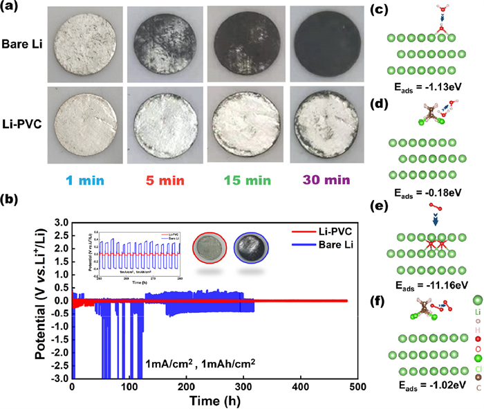 | Fig. 2. (a) Bare lithium and Li-PVC exposed to air. (b) After exposure to air, the voltage curves of a symmetrical Li|Li cell were measured at a current density of 1 mA/cm2 with a capacity of 1 mAh/cm2. Atomic conformations and adsorption energy for H2O species adsorption on (c) Li (111), and (d) Li (111) with PVC molecules (Eads stands for adsorption energy). Atomic conformations and adsorption energy for O2 species adsorption on (e) Li (111), and (f) Li (111) with PVC molecules. The arrow points from before to after structural optimization. | |
