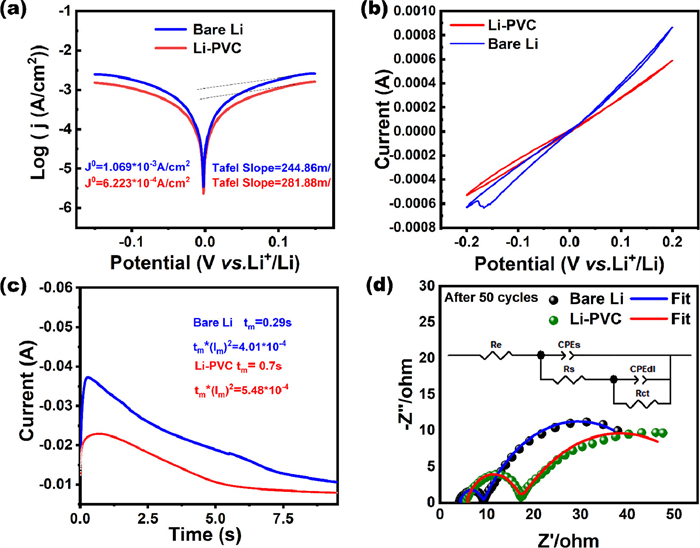 | Fig. 4. (a) Tafel curves of Li symmetric cells. (b) CV curves. (c) Time current curves in the chronoamperometry. (d) Equivalent circuit of Nyquist diagram after 50 cycles (Re is the body impedance, Rs is the SEI impedance, Rct is the charge transfer impedance, and CPE is the constant phase element). | |