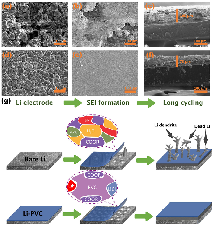 | Fig. 5. (a, b, d, e) Top view and (c, f) cross view SEM images of Li deposits (1 mAh/cm2, 1 mA/cm2 after 50 cycles) on (a-c) bare Li and (d-f) Li-PVC. (g) Schematic illustrations of Li plating behavior. | |