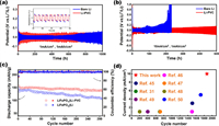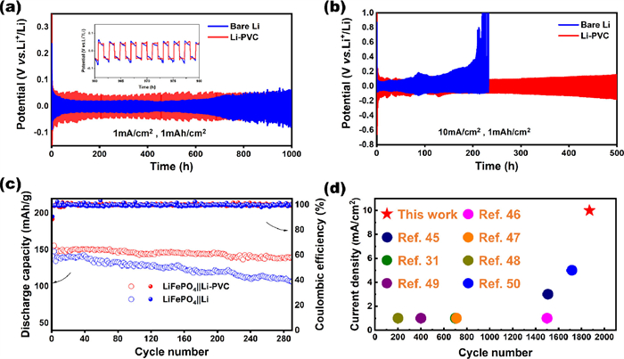 | Fig. 6. (a, b) Symmetric Li|Li coin cell curve in a wide range of current density with a fixed capacity of 1 mAh/cm2. (c) Li||LFP and Li-PVC||LFP coin cell in the current density of 0.5 C under long-term cycle performance. (d) The comparison of this work with other reports. | |