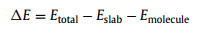 where the Etotal represents the energy of the whole after adsorption, the Eslab represents the energy of the adsorbed substrate, and the Emolecule represents the energy of the adsorbed molecules.