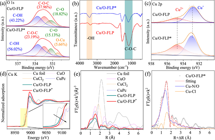| Fig. 1. The structural modulation of Cu/O-FLP and Cu/O-FLP* catalysts. (a) The O 1s XPS spectra, (b) FT-IR spectra, and (c) the Cu 2p XPS spectra of Cu/O-FLP and Cu/O-FLP*. (d) The Cu K-edge XANES spectra and (e) Fourier transform of the k2-weighted χ-EXAFS data of Cu/O-FLP and Cu/O-FLP*. (f) EXAFS fitting result at R space of Cu/O-FLP*. | |