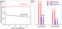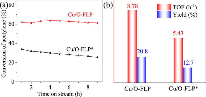 | Fig. 2. Catalyst performance evaluation over Cu/O-FLP and Cu/O-FLP* catalyst. (a) The conversion of acetylene. Reaction conditions: 180 ℃, VHCl/VC2H2 = 1.15 and GHSV(C2H2) = 180 h−1. (b) TOF value and vinyl chloride monomer yield. | |