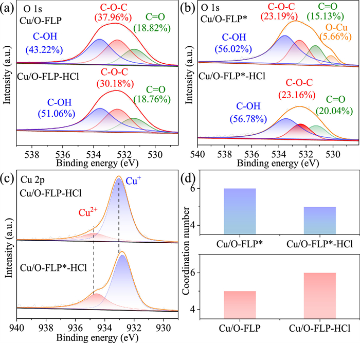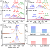 | Fig. 3. The chemical state of Cu/O-FLP-HCl and Cu/O-FLP*-HCl catalyst. (a) The O 1s XPS spectra of Cu/O-FLP and Cu/O-FLP-HCl. (b) The O 1s XPS spectra of Cu/O-FLP* and Cu/O-FLP*-HCl. (c) The Cu 2p XPS spectra of Cu/O-FLP-HCl and Cu/O-FLP*-HCl. (d) Coordination number of Cu/O-FLP, Cu/O-FLP*, Cu/O-FLP-HCl and Cu/O-FLP*-HCl. | |