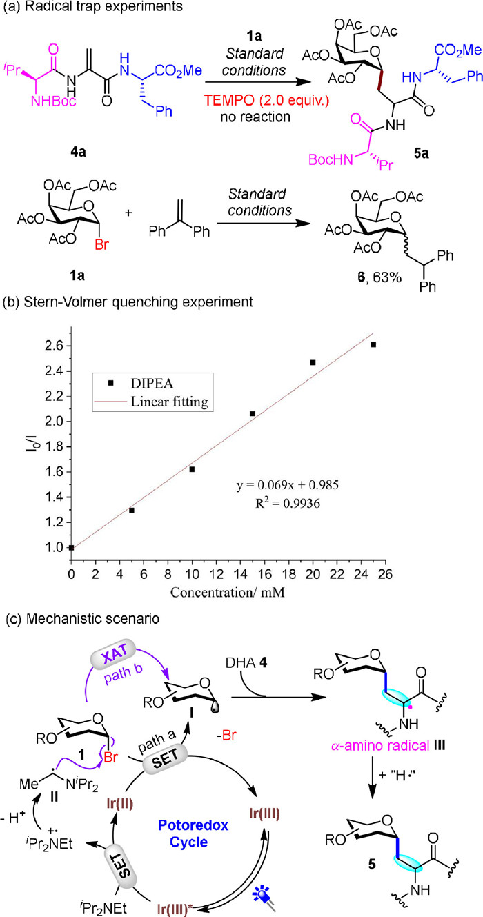 After the exploration of the substrate scopes, we then investigate the reaction mechanism. As shown in Fig. 1a, the addition of 2.0 equiv. of 2,2,6,6-tetramethyl-1-piperidyloxy (TEMPO) into the reaction mixture under standard conditions could inhibit the desired reaction completely. When DHA 4a was replaced by 1,1-diphenylene (5 equiv.), the galactosyl radical-trapping product 6 was obtained in a 63% yield (Fig. 1a). These experiments indicated that the galactosyl radicals may participate in the reaction process. The Stern-Volmer quenching experiment supported that DIPEA was the quencher of the excited photocatalyst (Fig. 1b).