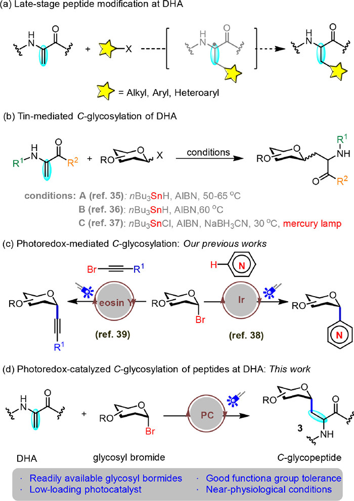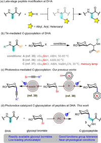 | Scheme 1. Modification of DHA and construction of C-glycosidic bond. (a) Late-stage peptide modification at DHA. (b) Tin-mediated C-glycosylation of DHA. (c) Our previous works of C-glycosylation. (d) Photoredox-catalyzed C-glycosylation of DHA in peptides. PC = photocatalyst. | |