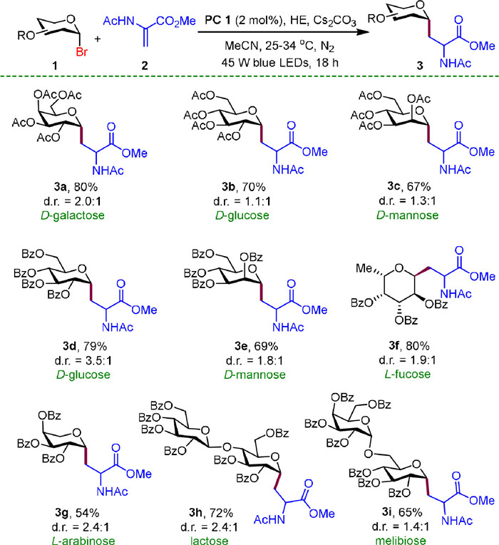 Having established the optimized reaction conditions, we began to test the reactivity of various glycosyl bromides with α,β-dehydroalanine 2. As shown in Scheme 2, D-galactose-, D-glucose-, D-mannose-, D-fucose- and D-arabinose-derived bromides underwent this reaction smoothly to give C-glycopeptide 3a-3i with moderate to good yields (54%−80%) and α-stereoselectivity. In addition, disaccharide-derived bromides (such as lactose and melibiose) could also be used as the coupling couplers and the C-glycosylation products 3h and 3i were generated in satisfactory yields (72% and 65% respectively). The α-configuration was carefully established by 1H NMR analysis based on coupling constants [47,48].