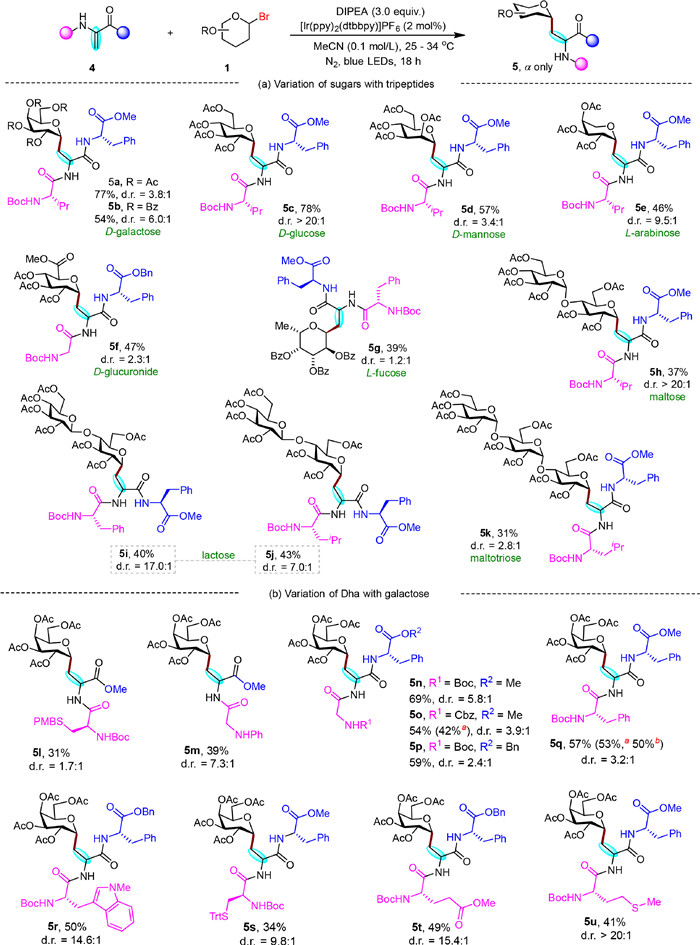| Scheme 3. Scope of glycosyl bromides and DHA-containing peptides. Reaction conditions: A solution of 4 (0.2 mmol), 1 (0.3 mmol), PC 1 (2 mol%), DIPEA (0.6 mmol) in MeCN (2 mL) was irradiated by 45 W blue LEDs for 18 h, isolated yield. a 1.4-Dioxane/phosphate pH 7.0 buffer (3:1, 2 mL) instead of MeCN. b MeCN/phosphate pH 7.0 buffer (3:1, 2 mL) instead of MeCN. | |
