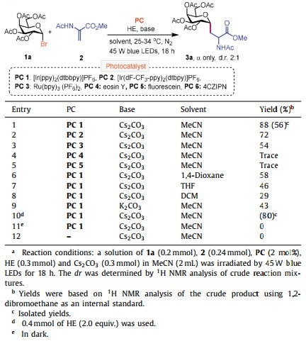 We initiated our studies by choosing galactose-derived bromide 1a and α,β-dehydroalanine 2 as the model substrates under various photoredox conditions. Some representative results are exhibited in Table 1 (For comprehensive reaction condition optimization, see Supporting information). Based on our previous works about C-glycosylation [42,43] and Gagné group's report on intermolecular addition of glycosyl halides to alkenes [46], the coupling of galactosyl bromide 1a and DHA 2 proceeded successfully to provide C-glycoalanine 3a in an 88% NMR yield (56% isolated yield), with acetonitrile as the solvent, [Ir(ppy)2(dtbbpy)]PF6 (PC 1, 2 mol%) as the photocatalyst (PC), Hantzsch ester (HE) as the reductive quencher and Cs2CO3 as the acid scavenger under the irradiation of 45 W blue LEDs (Table 1, entry 1). Other photocatalysts, such as [Ir(dF-CF3-ppy)2(dtbpy)]PF6 (PC 2), Ru(bpy)3(PF6)2 (PC 3), Eosin Y (PC 4), fluorescein (PC 5) were evaluated, but lower yields were obtained in all cases (entries 2–5). Solvents, such as 1,4-dioxane, tetrahydrofuran (THF) and dichloromethane (DCM), were also tested and no better result was achieved (entries 6–8). When Cs2CO3 was replaced by K2CO3, the yield decreased to 43% (entry 9). Delightfully, the isolated yield was improved to 80% when the 2 equiv. of HE was used (entry 10). As expected, no reaction was observed in the absence of blue light or the photocatalyst (entries 11 and 12). It is worth mentioning that C-glycoalanine 3a was produced with only α configuration at anomeric position and 2:1 diastereomeric ratio (dr) at α position of alanine in all cases.