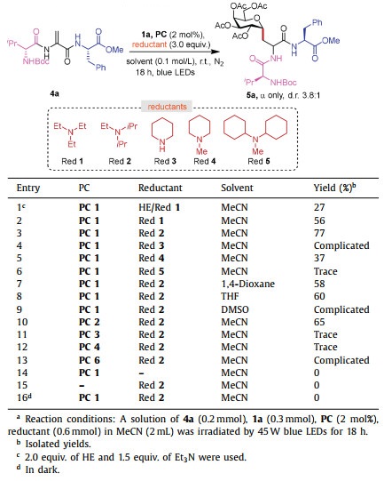After succeeding in C-glycosylation of α,β-dehydroalanine 2 with glycosyl bromides, we turned our attention to C-glycosylation of DHA-containing peptides. First, we chose DHA-containing tripeptide 4a as the model substrate. Unfortunately, the coupling of tripeptide 4a with glycosyl bromide 1a under our newly established optimized conditions in Table 1 resulted in a complicated reaction mixture and the desired C-glycopeptide 5a could not be identified. Therefore, we had to re-optimize the reaction conditions (Table 2). When Cs2CO3 was replaced by Et3N, the target C-glycopeptide 5a was obtained in 27% with only α configuration at anomeric position and 3.8:1 dr at α position of alanine (entry 1). Given that Et3N can serve as the reductive quencher and the acid scavenger, the dosage of Et3N increased to 3.0 equiv. without the addition of HE and the yield of 5a was improved to 56% (entry 2). Different reductants were tested (entries 3–6) and DIPEA (Red 2) gave the best result. Other solvents, such as 1,4-dioxane, THF and dimethyl sulfoxide (DMSO), were not superior to MeCN (entries 7–9). Subsequently, photocatalysts, such as [Ir(dF-CF3-ppy)2(dtbpy)]PF6 (PC 2), Ru(bpy)3(PF6)2 (PC 3), Eosin Y (PC 4), and 4CzIPN (PC 6), were also explored, but none of them showed better catalytic efficiency than PC 1 (entries 10–13). The control experiments showed that the blue light, photocatalyst and reductant were all indispensable for this reaction (entries 14–16).